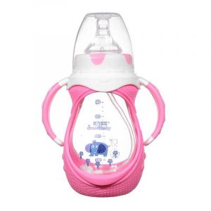 Baby-friendly new ultra wide mouth glass bottle wide mouth with cartoon silicone protective sleeve 360 degree feeding bottle